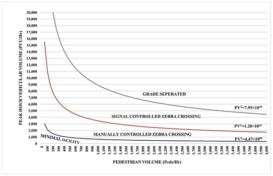 2 value. Initially, this approach involves plotting graphs correlating pedestrian volume (P) and vehicular volume (V) to establish recommended threshold values [