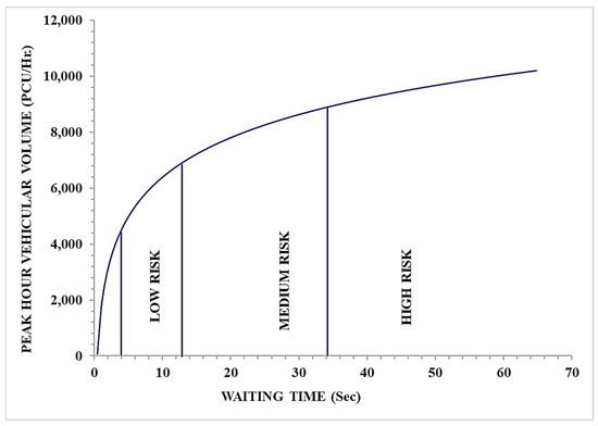 Figure 8. There is a rapid increase in waiting time up to the peak vehicular volume, after which the increment occurs more slowly. A brief explanation of the relationship is given in