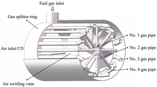 The burner model, designed for a power of 40 kW, is schematically depicted in Figure 2. Air is drawn in through four air inlets at the inlet end of the burner, while an air tangential cyclone structure is positioned at the outlet end. The gas inlet is located at the inlet end of the burner, and the gas pipes are divided into four groups according to the different positions and sizes. The No. 1 gas pipe, situated at the center of the cyclone structure, ensures flame stability. Six No. 2 gas pipes form a ring-shaped array perpendicular to the central axis at the pipe’s end, each featuring six symmetrically arranged gas nozzles along the pipe wall, enhancing gas–air mixing. Additionally, six No. 3 and No. 4 gas pipes are symmetrically positioned on either side of the No. 2 gas pipe to achieve dispersed combustion.