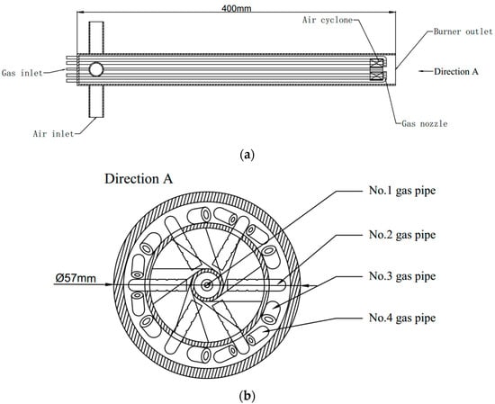 The newly developed low-NOx gas burner investigated in this study uses coke oven gas as combustion fuel. As shown in Figure 1, the burner optimizes the spatial distribution of gas and air by adopting air cyclone and gas dispersion jet technology. Combustion air is fed axially into the burner from the burner end face, while an air tangential cyclone structure is arranged at the burner outlet. The center of the cyclone structure is a direct current (DC) duct, and the outer ring area is a tangential cyclone blade at an angle of 30° to the axial direction. This cyclone structure divides the air into three parts: center DC air passing through the center DC duct, cyclone air passing through the cyclone vanes, and peripheral DC air passing through the outer edge. The center DC air ensures stable ignition and combustion of the central gas, while the cyclone air enhances turbulence intensity, promoting the mixing of gas and air. The peripheral DC air compensates for the rigidity shortcomings of the cyclone air, improving flame stability. Gas is introduced from the upper part of the burner, and after being distributed by the distribution ring, it is fed into the combustion chamber through several gas supply pipes. Gas is distributed by the distribution ring and then fed into the combustion chamber through several gas pipes.