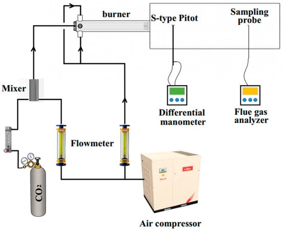 According to the approximate formulae provided in the literature [] for the flame length and diameter of oil (gas) burners, a cylindrical combustion chamber with dimensions of 230 mm in diameter and 700 mm in length was designed based on the burner power. The gas consumption for burner operation at rated conditions is 8.6 m3·h−1 and the air consumption is 39.21 m3·h−1. A diagram of the system for the cold-state test is shown in Figure 3. The required air was supplied by an axial-flow air compressor, and the gas was replaced by a mixture of carbon dioxide and air, which was mixed by a mixer and fed into the gas pipe. Each air supply pipe was equipped with a float flow meter to regulate and monitor the air flow. The burner’s aerodynamic field was measured using S-type Pitot tubes and a testo 512 differential manometer with a full-scale measurement accuracy of 0.5% and a resolution of 0.1 m/s, while the gas concentration field was measured using a Gamet dx4000 FTIR analyzer (Gasmet Technologies Oy, Helsinki, Finland) with a full-scale measurement accuracy of 1% and a resolution of 1 ppm. Table 1 displays the rated operating parameters of the burner.