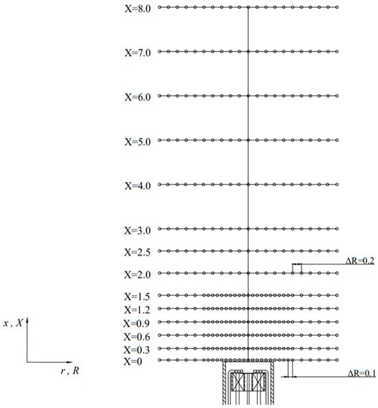 In order to accurately measure the aerodynamic and gas concentration fields in the combustion chamber, 14 rows of measurement points are arranged in the axial direction in the combustion chamber as shown in Figure 4. An approximate value of 50 mm for the inner diameter d of the burner outlet is taken as the reference distance, thus defining the dimensionless radius as R = r/d and the dimensionless axial distance of the measurement points as X = x/d. r is the distance from the center axis where the measurement point is located/mm. x is the distance from the measurement point to the burner nozzle cross-section/mm.
