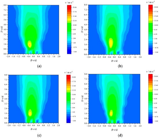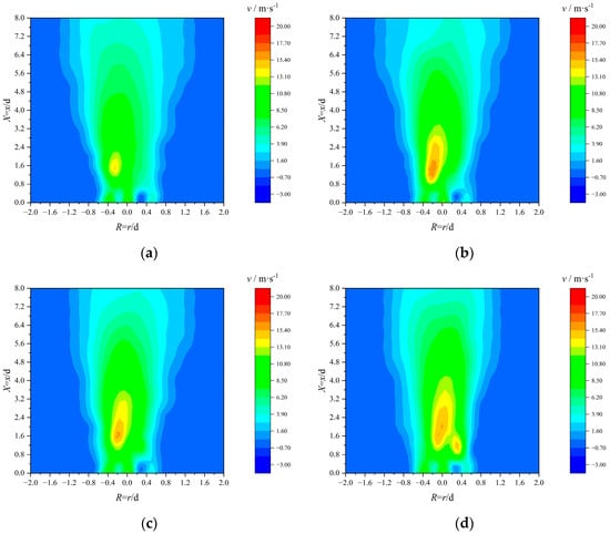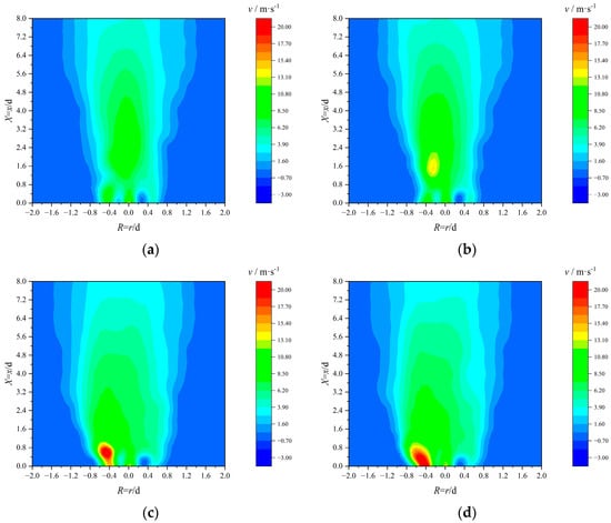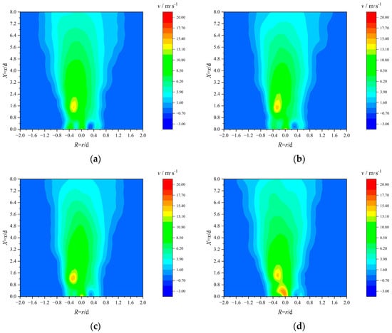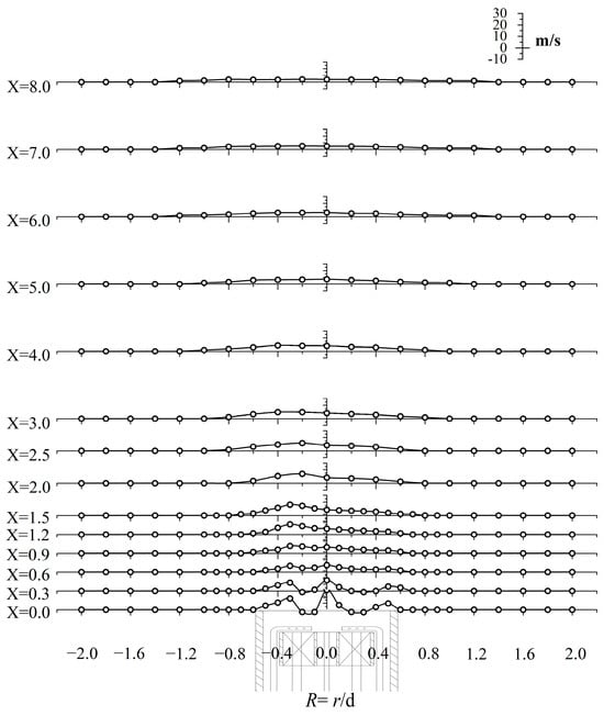 As shown in Figure 6, the experimental results reveal that the high-speed center jet expelled from the No. 1 gas nozzle heightens the velocity along the center axis at the X = 0.0 cross-section. This center jet elevates the gas flow’s rigidity, enhancing its stability and consequently stabilizing flame combustion. The bend design of the No. 2 gas pipe not only facilitates the formation of a radial distribution of uniform gas spouting at the burner outlet cross-section but also acts as a turbulence-induced disturbance on the blunt body, reinforcing gas flow and thereby promoting gas–air mixing. With a continued increase in R, owing to the absence of gas pipe obstruction, the peripheral DC air can smoothly enter the combustion chamber, thereby augmenting the peripheral velocity at the burner nozzle. Increasing the airflow’s peripheral velocity can further fortify jet stability. However, the intensified peripheral DC jet may impede outward expansion of the intermediate cyclone wind, reducing the jet’s overall expansion angle.