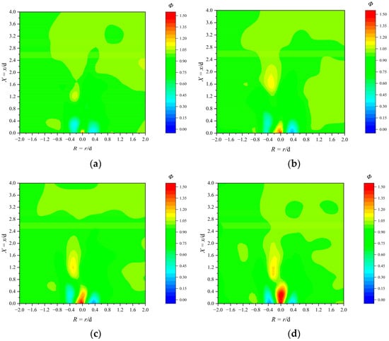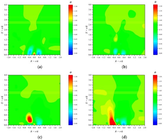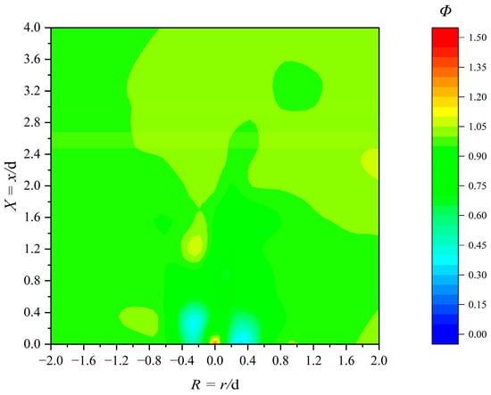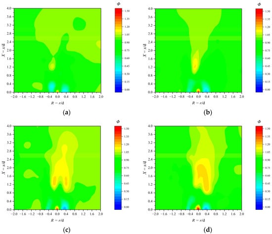 As seen in Figure 7, the experimental results show that the gas is uniformly distributed overall, yet significant fluctuations in the gas distribution occur in front of the burner outlet (−0.5 < R < 0.5, 0.0 < X < 0.4). Gas expelled from the No. 1 gas pipe amplifies the gas concentration at the center axis of the X = 0.0 cross-section, leading to an increase in Φ. Timely interception of the gas post-ejection aids in flame stabilization and prevents flameout.