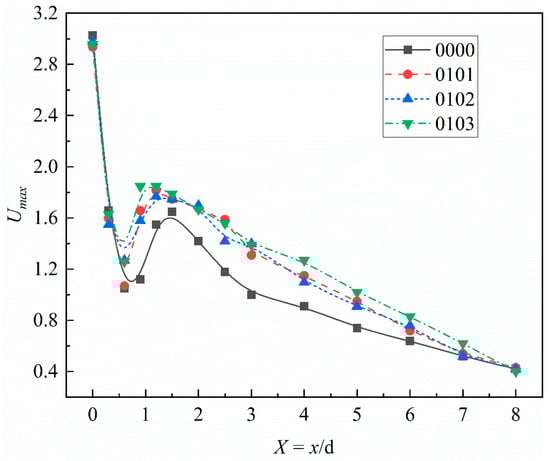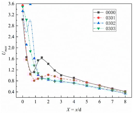 The cross-section maximum dimensionless velocity can reflect the decay of the jet velocity with jet distance. In Figure 9, the maximum dimensionless velocity increases in the cross-section region of 1.0 < X < 1.5, which is caused by the high-speed gas jet from the No. 3 gas pipe. In cases 0101, 0102, and 0103, β has the effect of penetrating the cyclone airflow layer. This structure strengthens the mixing and increases the mass flow rate of the center gas stream, which is conducive to improving the rigidity of the jet, and slows down the decay of the maximum velocity compared to Case 0000 (original structure).