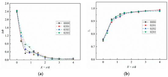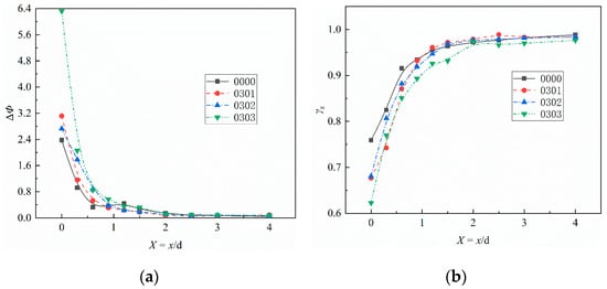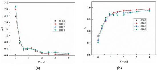 Figure 18b illustrates a decrease in gas–air mixing uniformity within the range of 0.0 < X < 1.0 due to the exacerbated dimensionless fuel–air ratio fluctuations mentioned earlier. However, in the interval of 1.0 < X < 3.0, the uniformity index of Case 0301 surpasses that of Case 0000. This difference arises from the reduction in α, which mitigates the degree of local gas aggregation.