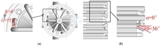 The cold test primarily examined the impact of different angle designs of No. 3 and No. 4 gas pipes on the aerodynamic field and gas concentration field of the burner. The specifics of No. 3 and No. 4 gas nozzles are shown in Figure 5. The deflection angle of the nozzle direction for the No. 3 gas pipe is represented as β relative to the circumferential tangent direction, while the bending angle is represented as α relative to the axial direction. Similarly, the deflection angle of the nozzle direction for the No. 4 gas pipe is represented as λ relative to the circumferential tangent direction, with the bending angle as θ relative to the axial direction. The arrangement of all the test conditions is outlined in Table 3.