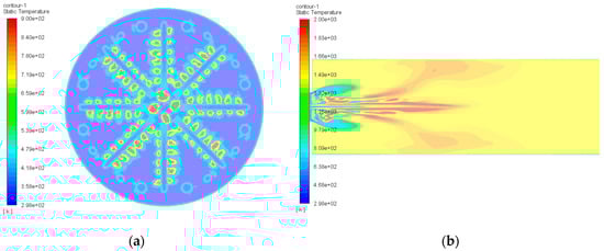 Temperature distribution cloud. (a) Temperature distribution cloud of burner nozzle cross section; (b) cloud view of flue gas temperature distribution in the combustion chamber.