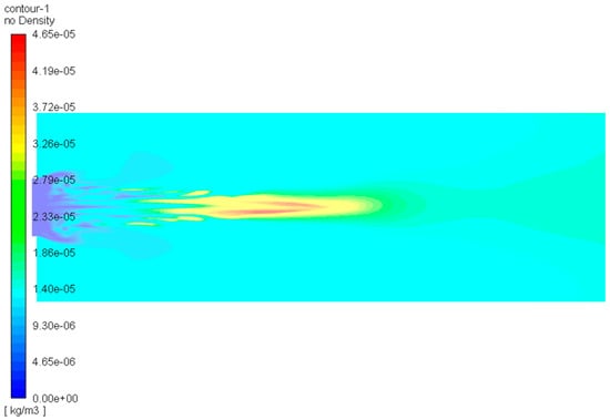 The NOx produced during the combustion process is mainly in the form of NO with negligible NO2 content. As shown in Figure 23, higher temperatures in the combustion core resulted in thermal NO production at a concentration around 39.5 mg/m3. With the mixing of the cyclonic air, the NO concentration gradually decreases. The NO distribution downstream of the combustion chamber tends to be uniform, and the original NO concentration at the exit cross-section of the combustion chamber is about 17.00 mg/m3 (3.5% oxygen content).