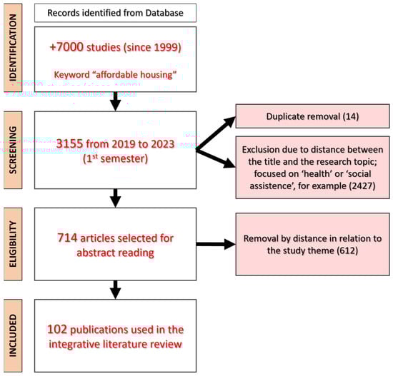 A bibliometric analysis was involved in the descriptive analysis of this work, uploading all citation information of the articles considered (title, author, abstract, and keywords) in the VOS Viewer software (version 1.6.20) and creating keyword groups. The binary counting option was used to remove duplicate documents in clusters. The VOS Viewer software (version 1.6.20) identified how many relevant words appeared in the title and summary fields of all submitted documents, taking into consideration restraining the results to a minimum number of occurrences and eliminating general terms that are not related to the question such as “Article”, “facility”, “Time”, “Place”, “Work”, “thing”, and “health”. A total of 7000 documents were retrieved. At this level of the analysis, the number of words was considered relevant, though the number of occurrences was considerably reduced, being temporally reduced to 3155 (from 2019 to 2023). Eventually, the list of keywords was released and each cluster generated was examined and used to further refine this search. It should be noted that this step was not applied using the results found in the first search (only with the term “affordable housing”), due to its breadth and the amount of documents returned.