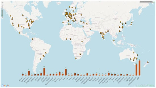 GPS Visualizer software was used to create a map of the affiliations of the documents found. The first step herein is to develop a toolbox in BibExcel software, version 2016-02-20, based on transforming the file (.csv) with citation information retrieved from the Elsevier database in location information (latitude, longitude, name, and description). Then, the developed toolbox could be inserted into the GPS Visualizer software to perform the required reading, decoding, and georeferencing on a map (using the Google Maps platform by generating Google API key code), pointing out the countries in which the documents originated. Thus, the countries of origin of the documents analyzed are presented in Figure 4, for ease of visualization.