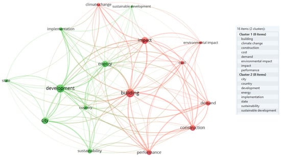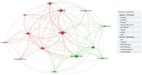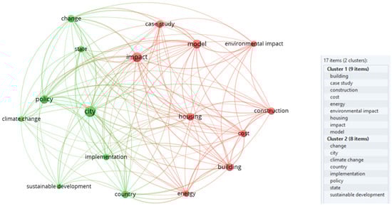 Four keywords were included in the last research for this study; “affordable housing”, “sustainability”, “energy efficiency”, and “environmental impact”; a total of 109 articles were retrieved. The importance is given to the centralization of all research; in Figure 11, the cluster in green (i.e., “development” and “energy”) presents terms related to the aspects of governance and environment and the red one (i.e., “building” and “impact”) reaches the technical issues of the theme more focused on environmental and civil engineering.