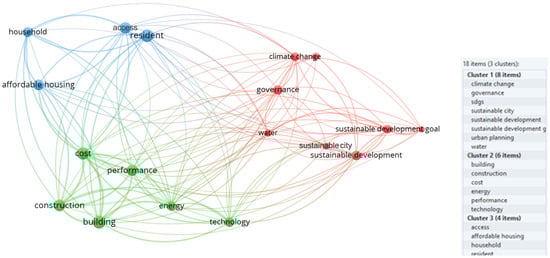 The fourth search, which used the terms “affordable housing” and “sustainability”, retrieved 1835 documents. It led to more than 14,000 keywords identified in the “title” and “summary” fields. However, upon restraining the results to a minimum of 70 occurrences and excluding generic terms, only 33 keywords reached the limit; 18 of them were considered more relevant and then, after checking the preliminary results, the results of the cluster analysis were generated, as shown in Figure 7.