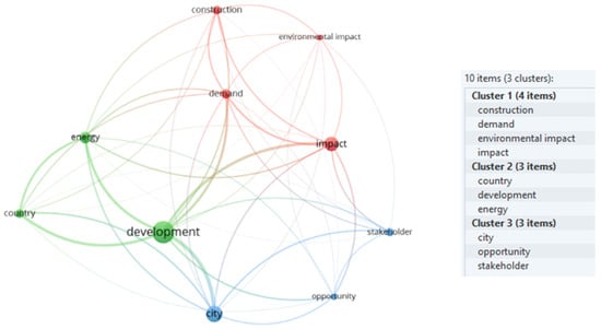 In the second survey, terms such as “affordable housing” and “environmental impact” were applied and 416 documents were retrieved. Using the (.ris) documents in the VOS Viewer (version 1.6.20), more than 4000 keywords were identified in the “title” and “summary” fields. However, upon restraining the results to a minimum of 250 occurrences and excluding generic terms, only 39 keywords reached the limit; 17 of them were considered more relevant and then, after checking the preliminary results, the results of the cluster analysis were generated, as shown in Figure 5.