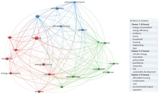 Three keywords were included in the seventh search; “affordable housing”, “sustainability”, and “energy efficiency”. A total of 264 relevant expressions were identified in a complete (binary) scan; marking 20 items divided into three clusters, as presented in Figure 10.