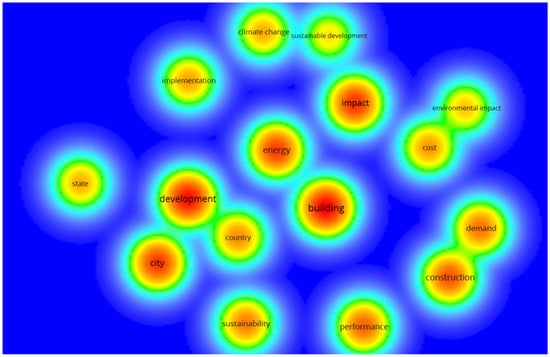 The density analysis for the last research is the most comprehensive in terms of the selected keywords that highlight the radial dispersion between the terms and their arrangements depending on the main keyword “building”, as seen in Figure 12.