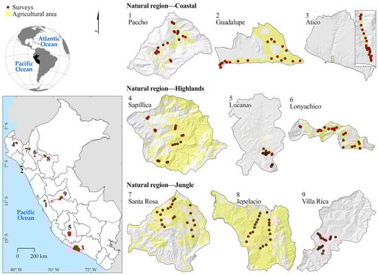 A total of 180 rural farmers located in the different districts of the three natural regions of Peru were randomly identified: from the coast (Sapillica, Guadalupe, and Atico), the highlands (Lucanas, Lonyachico, and Sapillica), and the jungle (Villa Rica, Jepelacio, and Santa Rosa). Each site was georeferenced according to map 1 and represents the productive agricultural diversity of Peru (Figure 1).