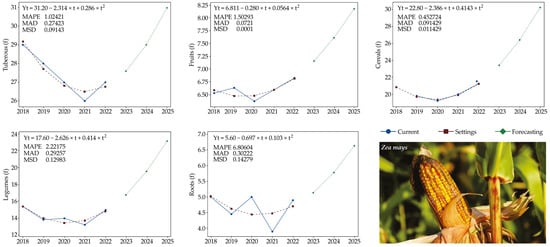 The annual frequency (2018–2022) on average was represented in trend models for the different types of crops. In all cases, the best fit (according to MAPE, MAD, and MSD) was presented using the quadratic trend model. MAD values showed values of 0.27 in tuberoses, 0.07 in fruits, 0.09 in cereals, 0.29 in legumes, and 0.30 in roots. Since tuberous are the lowest value, it means that they had the best fit for crop types. For all crop types, the model forecasts a positive upward trend (Figure 2). Regarding the ASM for crop type, the forecast for roots is wrong by 6.80%, this being the highest value of error identified. The rest of the ASM values for crop types are between 2.12% (legumes) and 0.46% (cereals). For the MSD measure, the accuracy of the adjusted values of the time series ranges from 0.07 in fruits (highest fit) to 0.27 in tuberoses, representing the lowest fit (Figure 2).