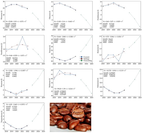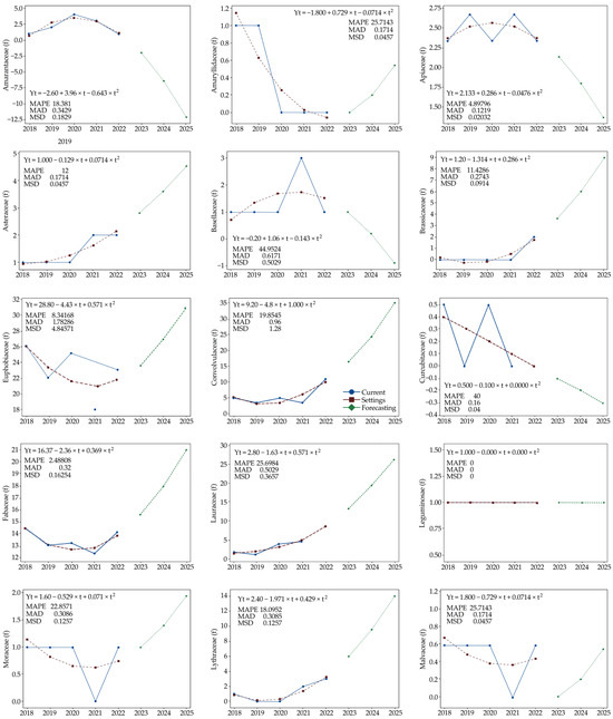 The historical trend and projection models to 2025 for productive agricultural diversity, according to crop family, are presented in Figure 3 and Figure 4. A total of 25 plant families were identified in the three natural regions, corresponding to nine districts of Peru. In this sense, the MAPE, MAD, and MSD values had the best fit for the quadratic trend model in all cases. For the year 2025, the projections in a positive trend correspond to the families of the poaceae, rutaceae, rosaceae, solanaceae, tropaeolaceae, malvaceae, lythraceae, moraceae, lauraceae, fabaceae, euphorbiaceae, convolvulaceae, brassicaceae, asteraceae, and amarillydaceae. On the other hand, the projections in a negative trend correspond to the families of passifloraceae, rubiaceae, olaceae, oxalidaceae, musaceae, cucurbitaceae, basellaceae, apiaceae, and amarantaceae.