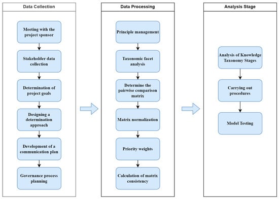 Figure 3 displays the steps for solving problems in classifying indicators. At the start of the research, data were collected through meetings with project sponsors and stakeholders, project objectives were determined, a determination approach was designed, a communication plan was prepared, and governance was planned, and then continued with data processing using exit management principles and an analysis of taxonomic aspects. After classification using taxonomy, weighing is carried out using the analytical hierarchy process (AHP), and finally, a further analysis is carried out.