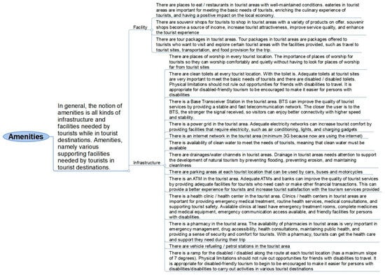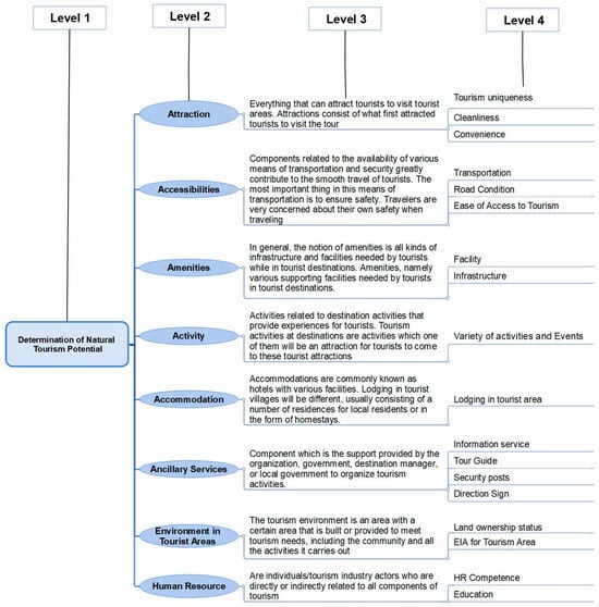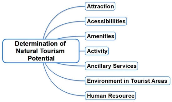 Economic income derived from tourist activities is determined mainly by the management of tourist attractions, tourism accessibility, public infrastructure, public facilities, and tourism facilities. The better the management of attractions, facilities, and accessibility, the more it affects the time tourists spend in tourist destinations and the income they receive from tourists [10,11]. According to [10], there are six components of tourism, namely attraction, amenities, accommodation, activity, accessibilities, and ancillary services (6A). 6A is a tourism development component consisting of the following: (1) Attraction is all elements that can attract visitors to the tourism area. Attraction is the first aspect that makes tourists interested in visiting the attraction. (2) Amenities refer to all the facilities and infrastructure visitors need at the tourist destination. (3) Accessibilities are elements related to the availability of various means of transportation and security aspects that have a significant role in ensuring that tourists’ trips run smoothly. (4) Accommodation is places to stay often known as hotels with various facilities. (5) Activity relates to activities at the destination that provide experiences for visitors. (6) Ancillary services are a component that is assistance provided by organizations, governments, destination managers, or local governments in carrying out tourism activities [10,12].
