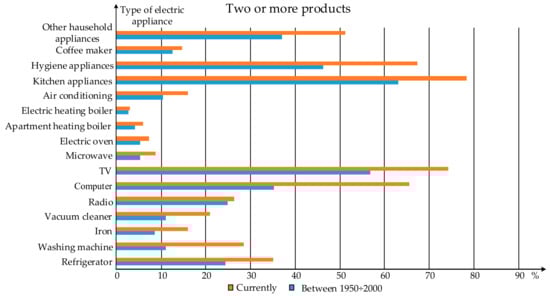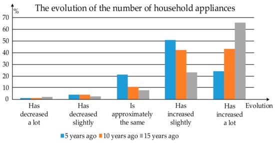 - To identify the evolution of the number of electrical appliances, where respondents had to compare the number of current electrical appliances to those from 5 years ago, 10 years ago, and 15 years ago. The comparison was made by choosing one of the response options: decreased significantly, decreased slightly, remained approximately constant, increased slightly, or increased significantly.