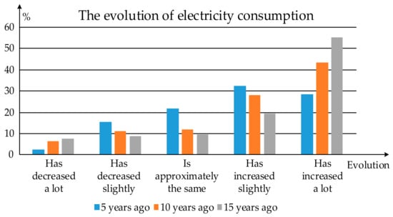 - To determine respondents’ opinion on the evolution of electricity consumption compared to 5 years ago, 10 years ago, and 15 years ago. For this item, respondents had to choose one of the following options: decreased significantly, decreased slightly, remained approximately constant, increased slightly, or increased significantly.