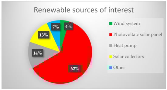 - The type of renewable energy source of interest, a question to which respondents had to choose one of the following options: wind system, photovoltaic solar panels, heat pumps, solar collectors for thermal energy, or others.