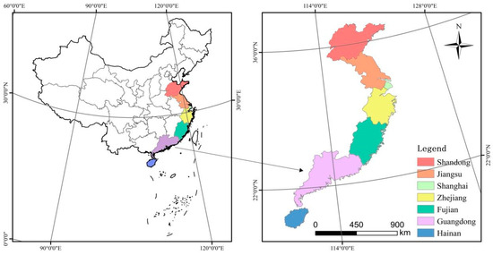 The scope of this paper encompasses seven eastern coastal provinces and cities: namely, Hainan Province, Guangdong Province, Fujian Province, Zhejiang Province, Jiangsu Province, Shanghai Municipality and Shandong Province. Notably, the Shanghai Municipality is treated as a distinct study unit due to its significant economic, demographic and carbon emission characteristics. Situated in the eastern coastal area of mainland China, this region experiences a humid climate and is endowed with abundant natural resources. It plays a crucial role in national ecological security, serving as a key component of the “Maritime Silk Road” and holding a pivotal position in economic and social development and sustainable construction. As of 2023, the research area spans approximately 700,000 square kilometers, accommodating a total population of approximately 452,790,000 people. The construction industry, a major economic contributor, engages more than 20 million individuals, with a total output value surpassing USD 1 billion. The swift expansion of industrial development and housing demand has led to the rapid growth of the construction sector in this region. Consequently, substantial carbon emissions contribute to environmental pollution, ecological degradation and issues such as wetland shrinkage. In light of these challenges, the paper focuses on a comprehensive study of Hainan Province, Guangdong Province, Fujian Province, Zhejiang Province, Jiangsu Province, Shanghai Municipality and Shandong Province. These six provinces and one municipality constitute the primary study area, as illustrated in Figure 1.