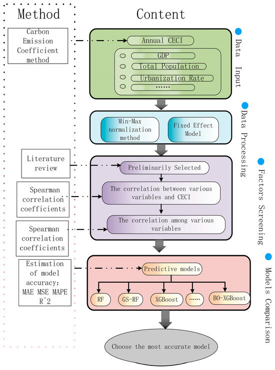 This study focuses on seven coastal provinces and cities in eastern China, using panel data from 2000 to 2020 as the dataset. There were three research stages, namely, data processing, influential factor selection and predictive model comparison. Considering both prediction accuracy and effectiveness, the BO-XGBoost model, which exhibits high prediction accuracy and strong global search capability, was identified as the most suitable model. The specific theoretical framework is illustrated in Figure 2.