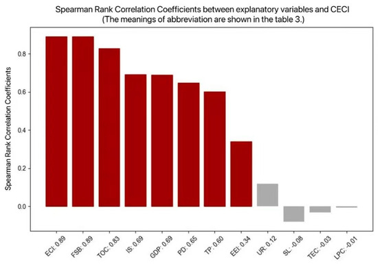 To rigorously examine the quantitative relationship between the 12 explanatory variables and the carbon emissions originating from the construction industry, this study employed the dataset to initially compute the individual fixed-effect coefficients for each province (PD). Subsequently, the Spearman’s rank correlation coefficient method was employed to assess the correlation coefficients between the 12 explanatory variables and the emissions from the construction industry. In tandem with a significance test, this aided in the meticulous screening of the explanatory variables. The correlation coefficients, along with their corresponding rankings, are visually presented in Figure 5.