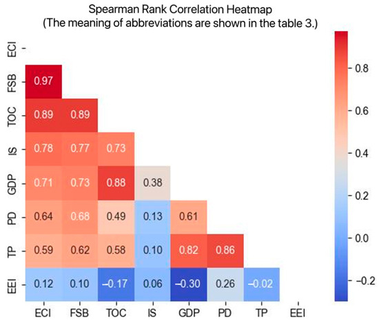 In this paper, numerous explanatory variables have been initially identified, each exerting different influences on the CECI. Some variables may exhibit low correlation with the final prediction outcomes. Therefore, in the process of forecasting carbon emissions from the construction industry, it is imperative to initially screen and analyze the selected explanatory variables. This step is crucial for enhancing the accuracy of the ultimate predictions. Given the intricate and non-linear nature of the relationship between explanatory variables and carbon emissions in the construction industry, the conventional Pearson correlation coefficient may not be the most suitable measure. Consequently, we opted to use the Spearman’s rank correlation coefficient to assess both the relationship between the 12 explanatory variables and CECI and the correlation among the 12 explanatory variables. Spearman’s rank correlation coefficients offer a more robust approach for capturing potential monotonic relationships, ensuring a comprehensive understanding of the intricate dynamics at play. The formula for Spearman’s rank correlation coefficient, Equation (4), is provided as follows: