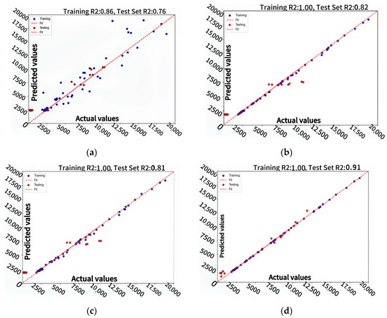 (a) Scatter plots of RF training and testing data; (b) scatter plots of XGBoost training and testing data; (c) scatter plots of GS-XGBoost training and testing data; (d) scatter plots of BO-XGBoost training and testing data.