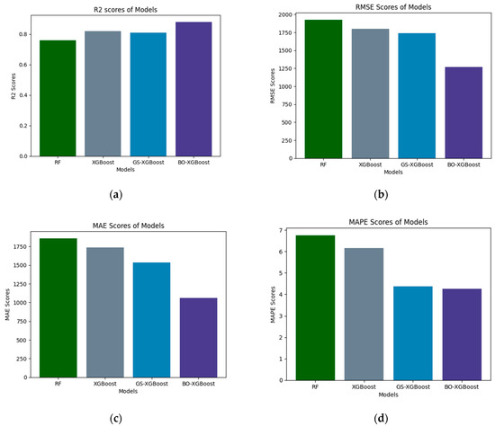 Error comparison of the developed models: (a) ; (b) RMSE; (c) MAE; (d) MAPE.