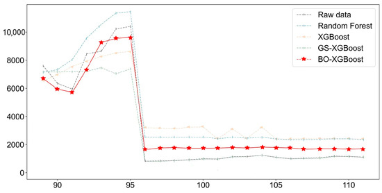 In order to more intuitively reflect the performance of each model, control tests were conducted using the default hyperparameter XGBoost model, GS-XGBoost and the Random Forest model. Figure 9 presents a comparison between the predicted values and the actual values. It is apparent that the BO-XGBoost demonstrated superior regression performance and higher prediction accuracy.