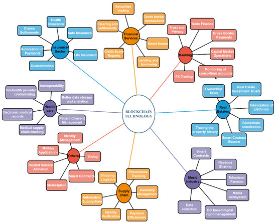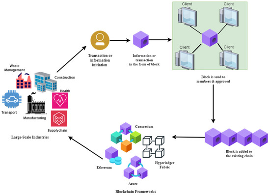 As blockchain technology offers secure internet transactions, people and industries are attempting to use it in light of the benefits it offers. This technology is utilized in almost all sectors as shown in Figure 1. The continuously depleting resources, environmental pollution, excessive energy consumption, and demand for sustainable industrialization are promoting change [16,17,18]. The Institute for Manufacturing at the University of Cambridge developed a definition explicitly for industrial sustainability [19]. Industrial sustainability is the basically conceptualization, design, and production of products and services that address the requirements of the current generation while not compromising economic, social, and environmental opportunities over the years [20].