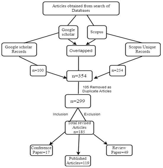 The final set of keywords was converted into search strings with the help of “AND” and “OR” connectors and a search was made on both databases. As Google Scholar is the largest database, the articles were screened against the research questions and the 150 best-fitting articles were selected by a panel of three scholars. Then, the titles, abstracts or keywords of the published articles or conference papers in Scopus were searched by applying the selected parameters, identifying 254 articles. When similar articles from both databases were scrutinized, 105 were removed as duplicates leaving behind 299 articles. After applying the inclusion and exclusion criteria, a total of 136 (119 published papers and 17 conference papers) best-fitted articles along with 49 review papers were selected for the systematic review (Figure 3).
