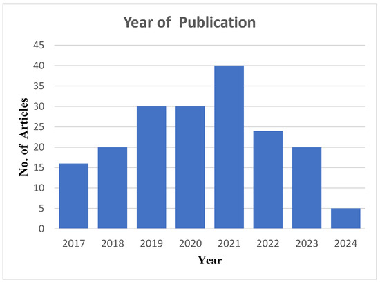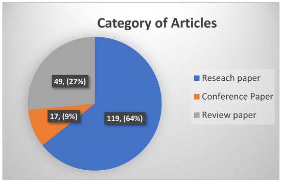 Descriptive analysis of the databases indicated the demand of the study as it is a rapidly growing research topic. The categories of the selected articles are shown in Figure 4. It demonstrates that 64% of our selected articles are the published papers of the highest-ranking journals and 9% are conference papers that lightened the recent topics of discussion. When the collected data were analyzed year wise (Figure 5), it was found that the publications regarding blockchain technology in industries for sustainability have been increasing with every year. Year 2017 has a limited number of articles regarding blockchain in industries, but then a drastic evolution has come regarding the use of blockchain technology to gain sustainability. Year 2021 indicated almost 40% increase in publications in four years. This indicated the evolution of the research toward decentralized technology for a greener future.