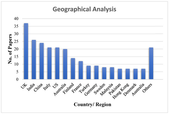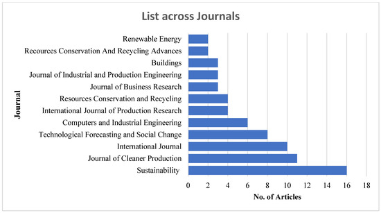 A geographical analysis of the selected articles was also carried out (Figure 6) and it was found that the UK region produced most of the published papers, around 37, followed by India having 26, China 24, Italy 21, US 21 and so on. This means that developed countries were more focused on moving toward decentralized technology as compared to developing ones. The reason behind this can be the available resources and advanced technology. Regional analysis indicated the importance of blockchain technology for large scale industries in major countries. A list of papers across the journals is presented in Figure 7. The majority of the papers were published in journals related to sustainability, such as Sustainability with 16 selected papers, Journal of Cleaner Production with 11 and Technological Forecasting and Social Change with 8. This shows the demand of blockchain for sustainability and circularity in the environment. The descriptive analysis showed that blockchain technology and industrial sustainability are emerging around the globe with the passage of time with their full potential as the demand for an advanced world in order to preserve reserves for future generations increases.