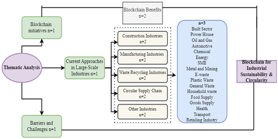 Circularity is developed as a systematic strategy to lock loops in industrial processes and to minimize waste through the recycling of products and resources at the end of their functional lives [86]. So, in order to create a CE, a technique for complete, transparent, and trustworthy material traceability is required. This method must also take into account the current state of the materials. This is required to put into practice the principles of a conscious approach, improved decision-making, and anticipatory planning for the most sustainable recovery and reusage of resources. Blockchain has been emerging as a fascinating tool for a number of industries. It can be used for all types of assets, both material and intangible. It has been utilized in many industrial sectors like the construction sector, waste recycling industries, supply chain management, healthcare industries, agri-food sectors, energy sector, manufacturing industries, light industry, trading and retail sector and transportation sector. The thematic map of the current approaches of blockchain in industries is shown in Figure 11.