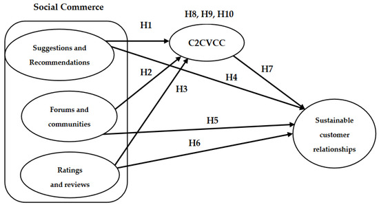 In the digital age, SC has emerged as a transformative force in the world of online retail, revolutionizing the way consumers shop and interact with brands. Unlike traditional e-commerce, SC seamlessly merges the power of social media with e-commerce platforms, creating a dynamic and interactive space where consumers can do much more than simply browse and purchase products. They can engage in meaningful interactions, share their experiences, seek peer recommendations, and actively participate in discussions related to products and services [7]. One key aspect that has garnered significant attention in this rapidly evolving landscape is the mediating role of C2CVCC. C2CVCC refers to the collaborative and interactive process where consumers actively contribute to the value generated during consumption experiences. This phenomenon is particularly pronounced in SC environments, where consumers become more than just shoppers; they become active participants in shaping their own and others’ purchasing decisions. C2C value co-creation fundamentally transforms the shopping journey in SC. Consumers who engage in this co-creative process experience a deeper level of engagement with the products and brands they encounter. They actively participate in discussions, share their opinions, and seek out peer recommendations. This heightened level of involvement enhances the overall shopping experience, making it more informative, engaging, and enjoyable. As a result, engaged consumers are not only more likely to make an initial purchase but are also more inclined to consider SCRs with the same platform or brand [41]. Furthermore, C2C interactions within SC platforms go beyond the transactional aspects of shopping. They create a sense of community and belonging among consumers. This community-building aspect is driven by shared interests, experiences, and mutual trust among participants. Consumers who feel connected to a community or social network within a specific platform are more likely to develop a sense of loyalty and attachment to both the platform itself and the brands present on it. This loyalty is a powerful driver of SCRs. Loyal customers, who have established a sense of trust and attachment to a social commerce platform or brand, are more inclined to have SCRs with products or services. They not only become repeat customers but also advocates who actively promote the platform or brand to their peers, further fueling the cycle of engagement and SCRs. Hence, we can propose the following hypotheses, as illustrated in Figure 1: