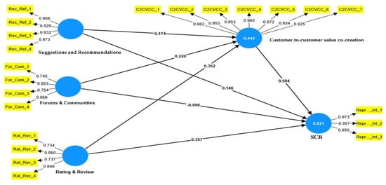 However, forums and communities failed to positively and significantly predict SCR (β = −0.096, p = 0.167), which did not support the fifth hypothesis (H5). Additionally, ratings and reviews (as a dimension of SC) were found to have significant positive impacts on C2CVCC (β = 0.352, p < 0.000) and SCR (β = 0.357, p < 0.000), which supported the third and sixth hypotheses (H3 and H6). Furthermore, C2CVCC was found to have a highly significant positive influence on SCR (β = 0.504, p < 0.000), which supported hypothesis seven (H7). Regarding the indirect effect of C2CVCC, the results show that C2CVV had a full mediation role that affected the impact of forums and communities on SCR (β = 0.111, p < 0.000), supporting hypothesis nine (H9). The direct path was found to be non-significant, as reported for hypothesis five (H5). The results of the PLS-SEM supported partial mediation roles played by C2CVCC in the impact of suggestions and recommendations on SCRs (β = 0.088, p < 0.000) and in the impact of ratings and reviews on SCR (β = 0.177, p < 0.000), supporting hypotheses eight and ten (H8 and H10).