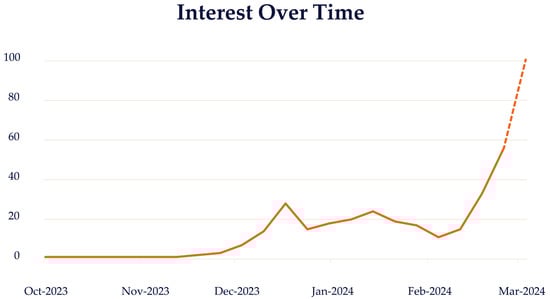 Consequently, Figure 1 illustrates a notable increase in interest in Web-GIS, as shown by the solid line representing Google Trends [] web search data for the past six months. The dotted line projects this trend into the future, suggesting continued growth in interest. This upward trend reflects the growing attention and awareness surrounding this subject in the context of natural hazard management, identifying a potential shift toward adopting and using Web-GIS as a pivotal tool for assessing resilience dimensions in an integrated manner. This systematic review makes it crucial to consider the implications behind this broad-based focus and appreciate its potential impact on the international panorama.