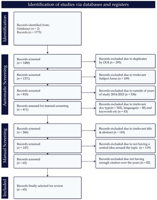 In the framework of the search, a total of 1775 records were identified from the selected databases. Automatic screening processes were then applied to remove duplicates, excluding 295 records. The subsequent screening steps involved assessing the relevance of titles and abstracts, which led to removing an additional 109 records about subject areas outside the study’s scope. Furthermore, records outside the specified publication period were excluded (536 records), along with those not meeting criteria related to document type, language, and keywords (424 records), leading to only 411 records (Table A1 in Appendix A). Finally, manual screening was conducted on the remaining records, thoroughly assessing full-text articles. This process excluded articles based on various criteria, including irrelevant titles and abstracts, the lack of a central idea related to the topic, and an insufficient citation impact over the years. Following the complete screening process outlined in Figure 4 based on the PRISMA model [] (Supplementary Materials), 65 articles were selected for review. The final selection criteria included only articles directly contributing to understanding Web-GIS applications in hazard management.