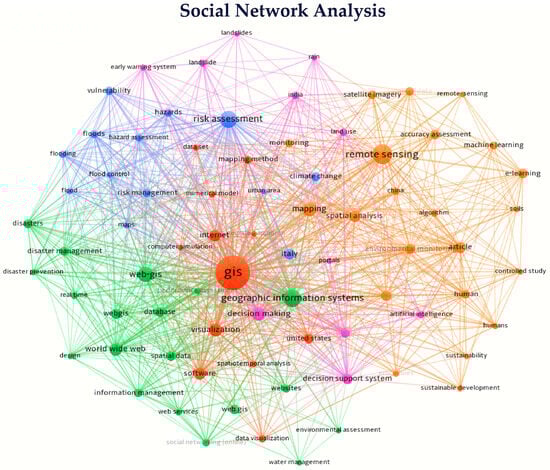 The selected articles were further analysed using Social Network Analysis (SNA) to identify clusters of keywords and themes. Figure 5 presents an SNA plot illustrating the relationships between keywords, facilitating the identification of subtopics for exploration. This visual representation aids in organising the literature into cohesive strands, guiding the systematic review process and enabling a comprehensive analysis of the current state of research in Web-GIS for natural hazard management.
