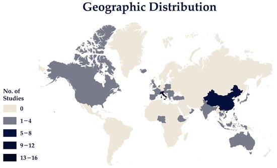 Figure 6 portrays the geographic distribution of studies included in the literature review, using a colour gradient to indicate the intensity of research activity across different countries. Italy is the most studied country, with 16 cases documented. This high research concentration can be attributed to Italy’s geographical complexity and vulnerability to diverse natural hazards, including seismic events, floods and landslides, and volcanic eruptions. The country’s geological diversity and densely populated urban areas make it a focal point for hazard research and mitigation efforts. The RETURN research project is currently underway precisely about these issues. It has been allocated significant resources and has an extended partnership to strengthen research chains on environmental, natural, and Man-made hazards nationally and to promote their participation in strategic European and global value chains [].
