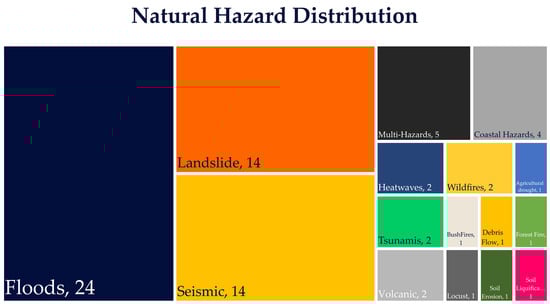 Coastal hazards, multi-hazards, and heatwaves are notable subjects of study, with four, five, and two occurrences, respectively. Coastal hazards, including storm surges, erosion, and sea-level rise, are of increasing concern due to climate change [,,] and coastal development. Multi-hazard approaches are essential for understanding the complex interactions between hazard types and developing comprehensive risk reduction strategies. Heatwaves, exacerbated by climate change, pose significant health risks and challenges for urban resilience and adaptation.