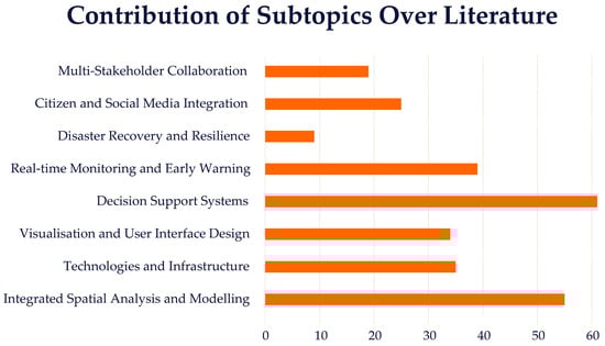 Figure 8 illustrates the distribution of papers across these subtopics, highlighting the varying degrees of emphasis within the literature. Notably, specific subtopics received significant contributions, indicating their prominence in the field. For instance, papers focusing on Decision Support Systems (61 papers) and Integrated Spatial Analysis and Modelling (55 papers) were particularly abundant, reflecting their importance in facilitating informed decision making and modelling hazard risks. Another question to note is the confluence between some of the subtopics analysed. As Figure 8 also emphasises, some themes in the selected papers recur in a pair. This fact is most evident for Real-time Monitoring and Early Warning compared with Decision Support Systems and Technologies and Infrastructures compared with Visualisation and User Interface Design subtopics. These groups have many aspects in common and could be evaluated as subsets of each other; however, they are kept separate precisely to stress specific aspects considered crucial. In the following detailed description of individual subtopics, these confluences are recalled.