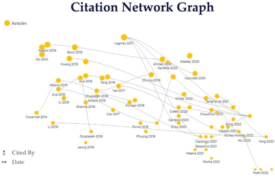 Given the considerable volume of papers addressing individual subtopics, the ensuing sections of the literature review are focused solely on articles deemed pivotal to the subject matter or those offering unique insights, thereby avoiding redundancy. This strategic approach ensures that the review remains focused and concise, allowing for a thorough examination of the most significant developments and findings according to the different dimensions of Web-GIS. Additionally, the citation network graph by Litmaps [] (Figure 9) provides insights into the connectivity and impact of the selected 65 papers. The graph illustrates the interconnections among these papers, highlighting the degree of citation and influence they have garnered over the years. The network structure indicates a robust exchange of ideas and knowledge within the research community, underscoring the quality and relevance of the selected literature.