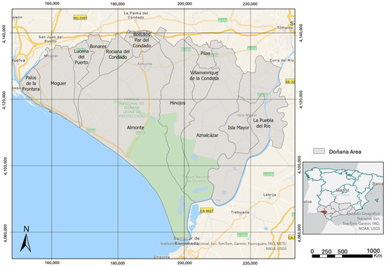 Encompassing municipalities across two provinces, Doñana’s territorial management plan includes Almonte, Bonares, Bollullos Par del Condado, Hinojos, Lucena del Puerto, Moguer, Palos de la Frontera, and Rociana del Condado in the Province of Huelva, and Aznalcázar, Isla Mayor, La Puebla del Río, Pilas, and Villamanrique de la Condesa in the Province of Seville (Figure 1).